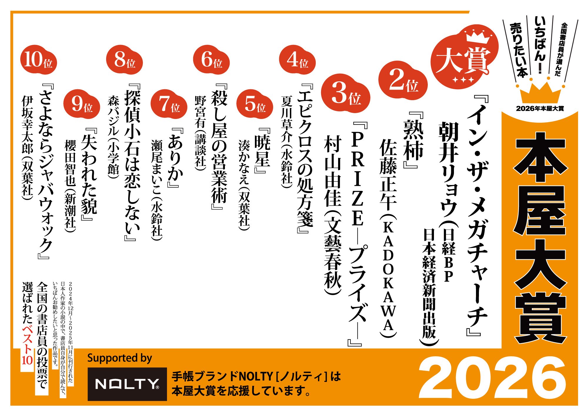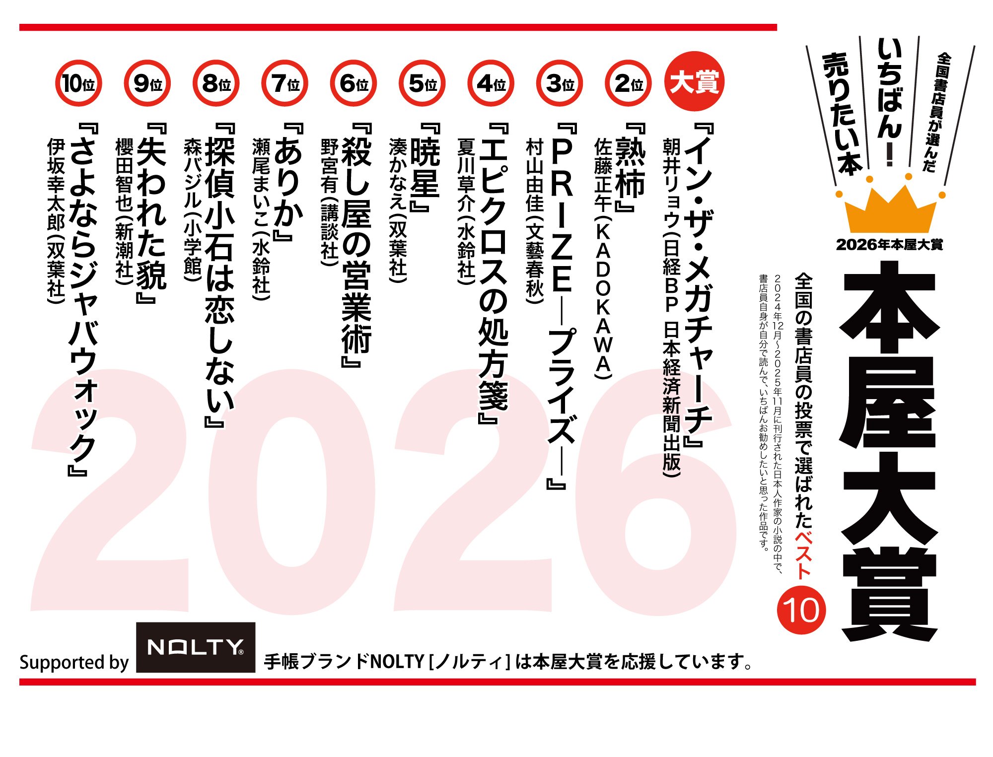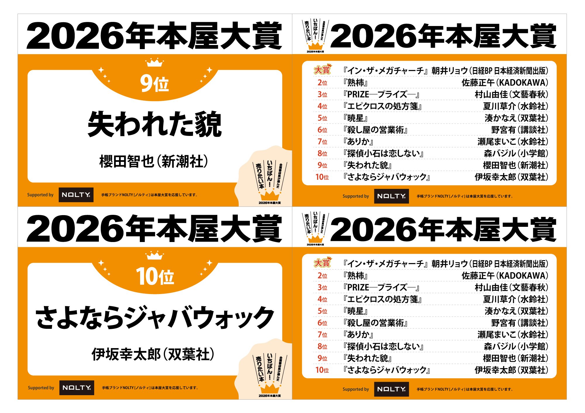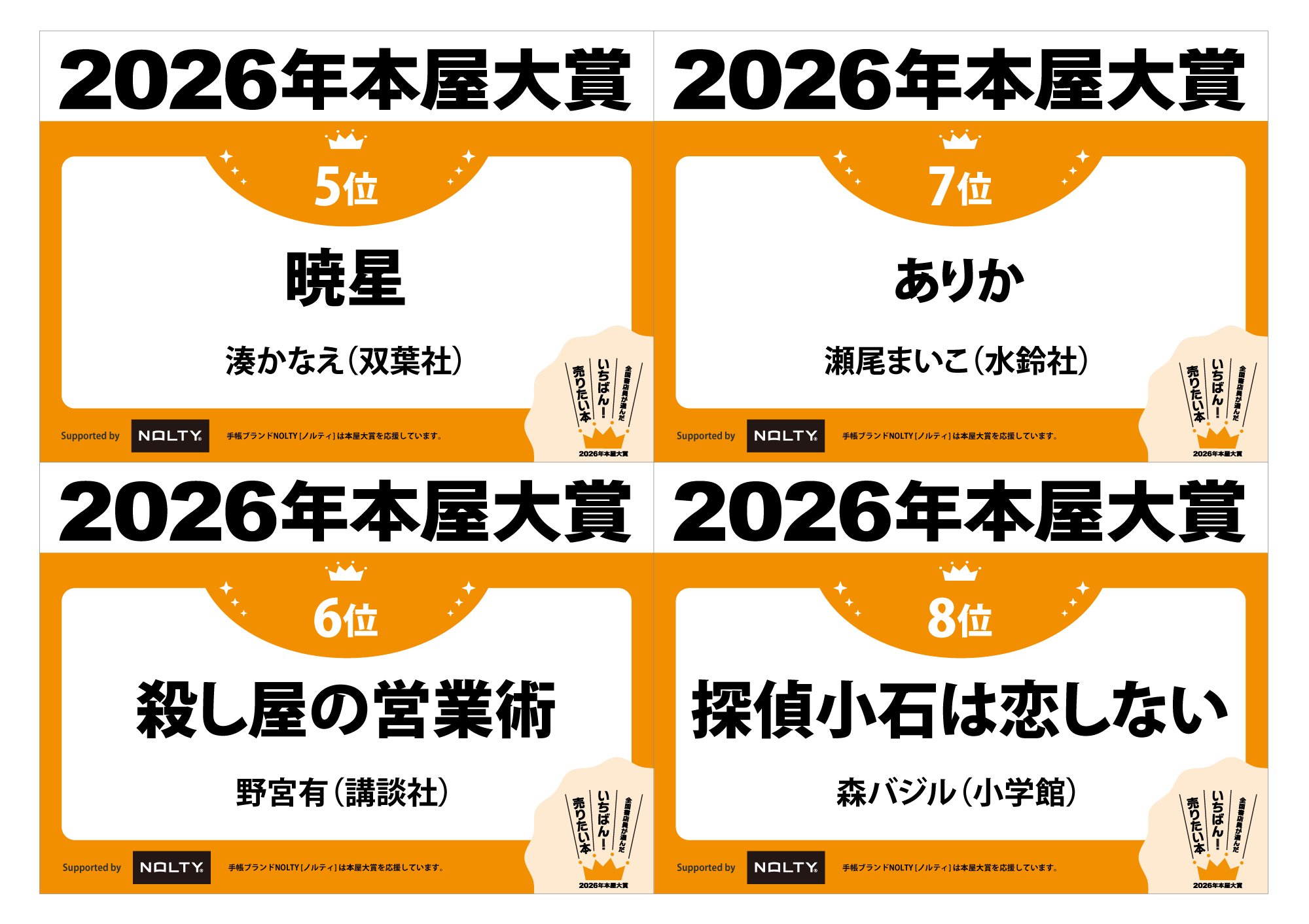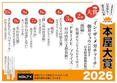 ノミネート全10作発表の書店店頭フェア用グッズを作りました。PDF、JPGファイルとなっていますので、プリントアウトしてそのまま貼ったり、用紙サイズを拡大して大きな看板にしたり、お好みに合わせてご利用ください。