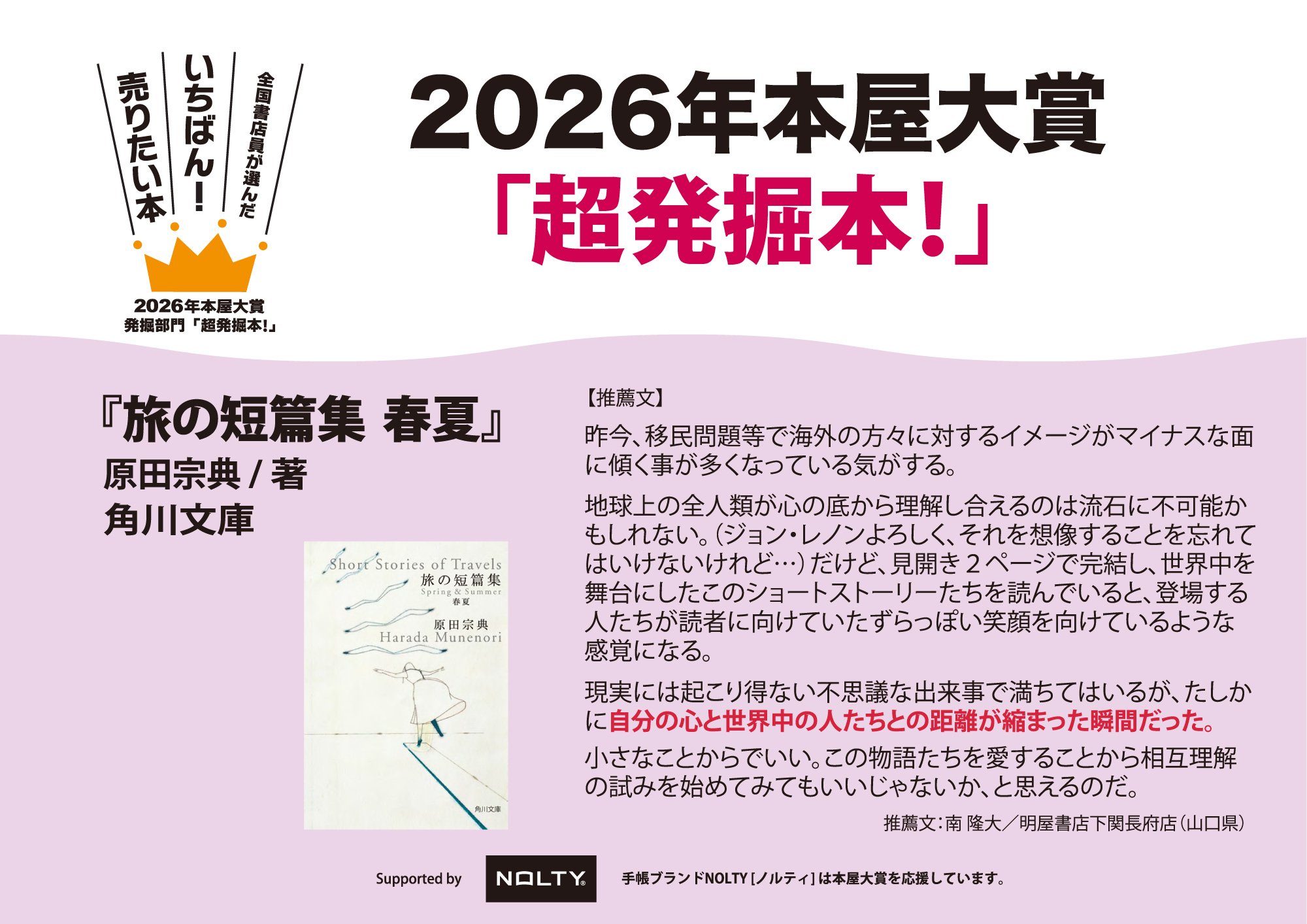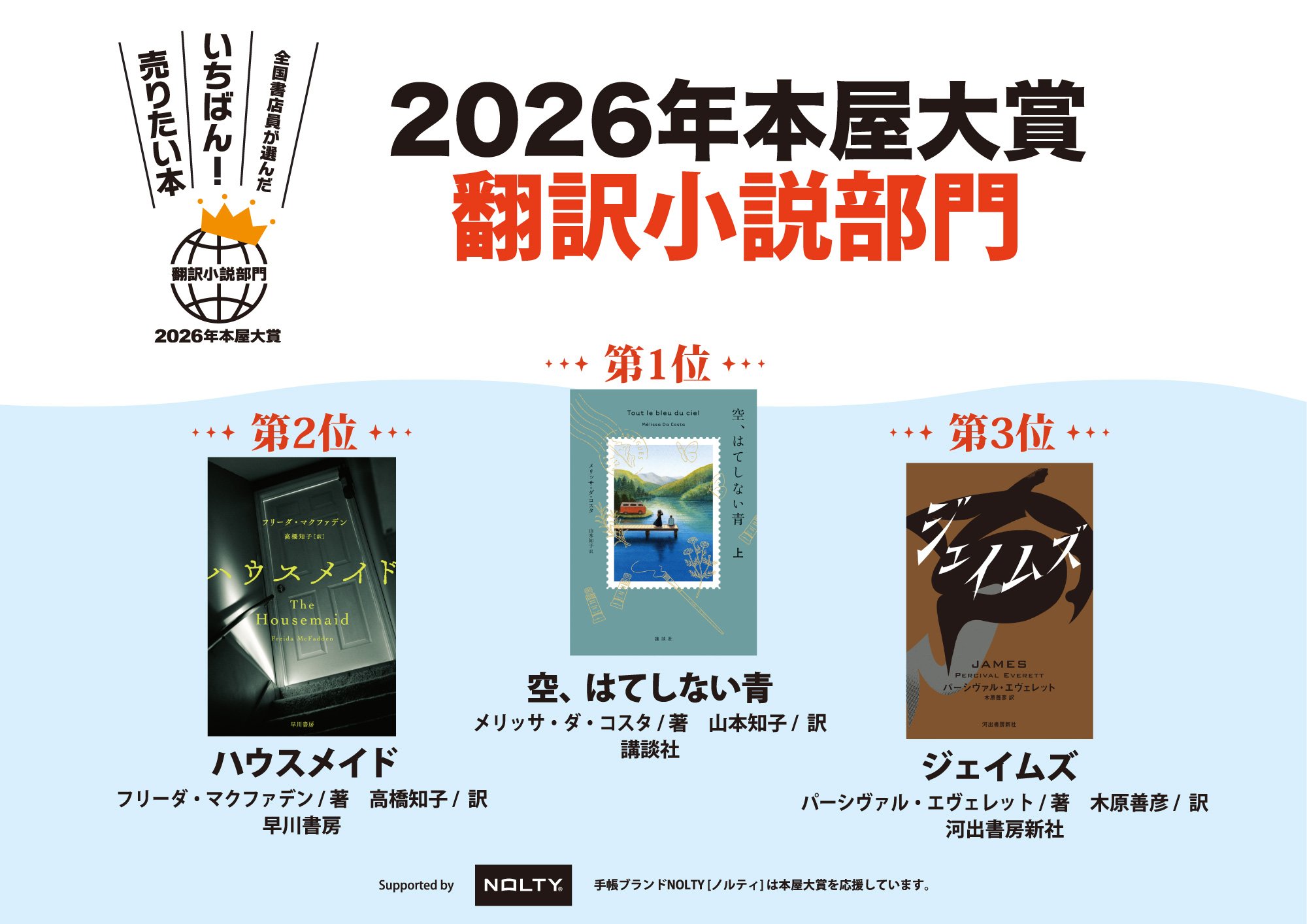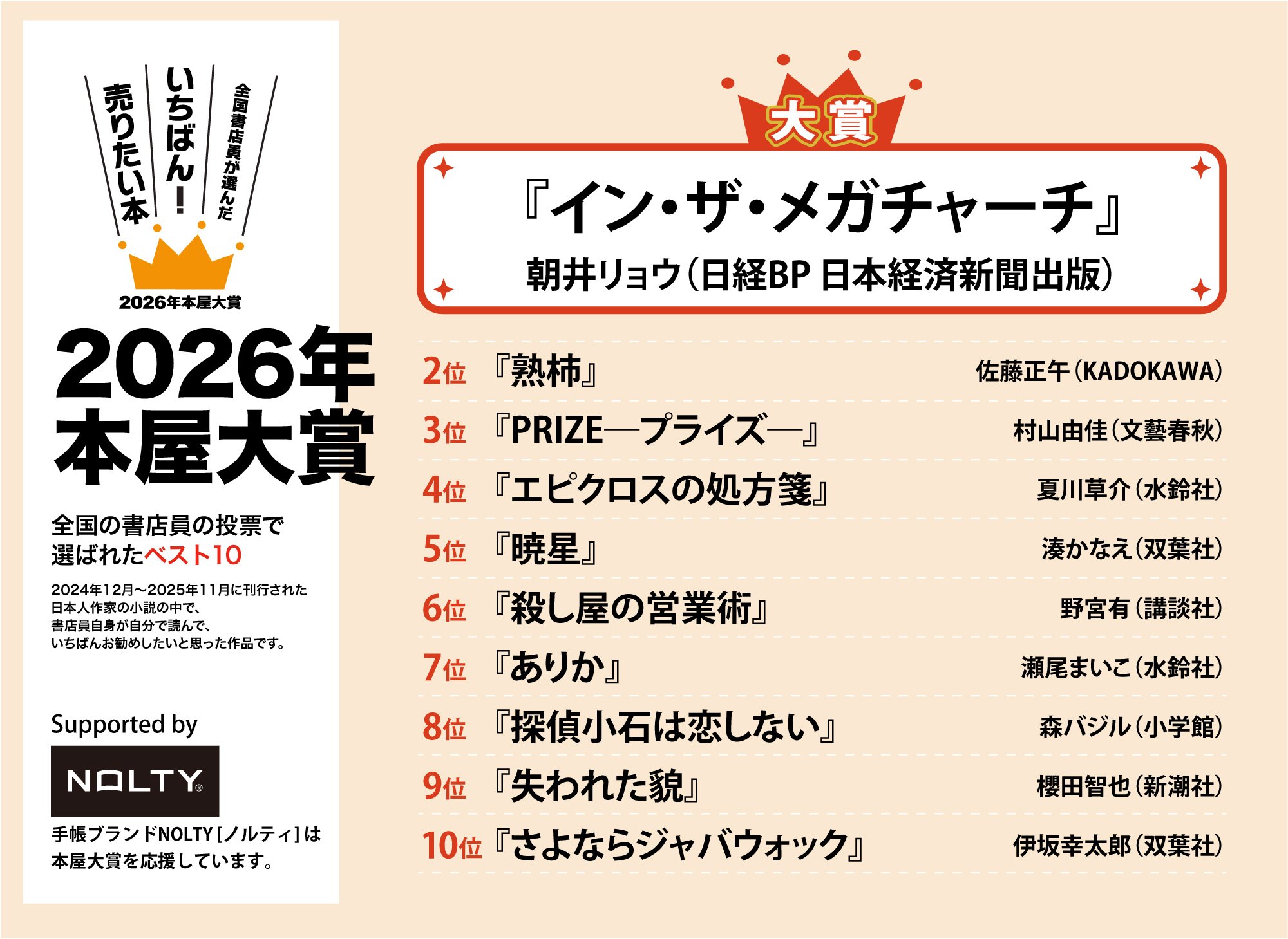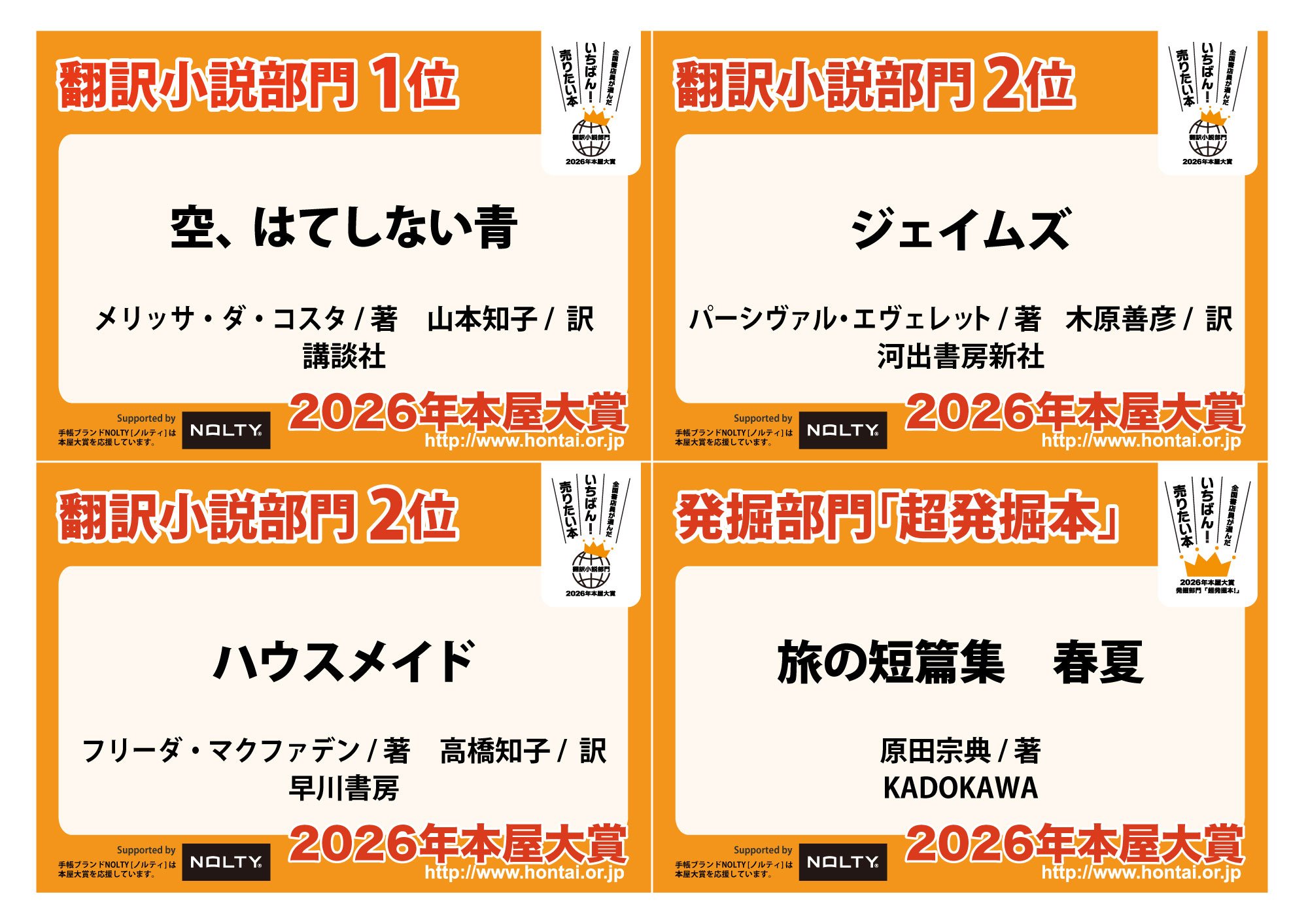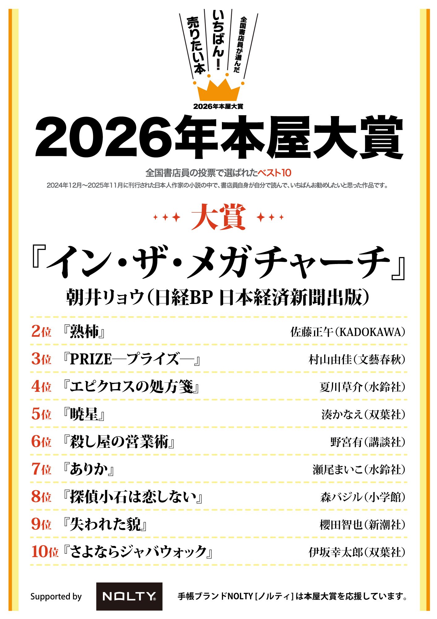ノミネート全10作発表の書店店頭フェア用グッズを作りました。PDF、JPGファイルとなっていますので、プリントアウトしてそのまま貼ったり、用紙サイズを拡大して大きな看板にしたり、お好みに合わせてご利用ください。